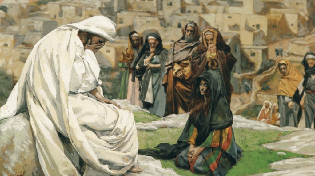 Ketika Yesus tiba di Betania untuk mengunjungi sahabat-Nya, Lazarus, yang baru saja meninggal, saudara perempuan Lazarus, Marta, menyambut-Nya terlebih dahulu. Ia mengungkapkan bahwa seandainya Yesus datang lebih awal, saudaranya tidak akan meninggal. Yesus meyakinkan Marta bahwa Dia adalah kebangkitan dan hidup. Marta mengakui imannya kepada-Nya, dan sejenak, segalanya tampak damai. Namun, ketenangan itu tidak berlangsung lama. Tak lama kemudian, Maria datang, dan mengulang kata-kata saudarinya. Namun, ia jatuh di kaki-Nya, menangis bersama mereka yang menyertainya. Yohanes sang Penginjil mencatat bahwa Yesus “sangat terharu” dan “tergerak hati-Nya.” Saat mereka membawa Yesus ke kuburan Lazarus, Ia tak lagi dapat menahan kesedihannya, dan Ia mulai menangis.